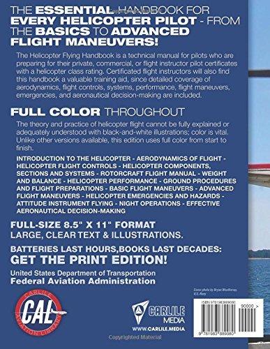 The Helicopter Flying Handbook is a technical manual for pilots who are preparing for their private, commercial, or flight instructor pilot certificates with a helicopter class rating. Certificated flight instructors will also find this handbook a valuable training aid, since detailed coverage of aerodynamics, flight controls, systems, performance, flight maneuvers, emergencies, and aeronautical decision-making are included.