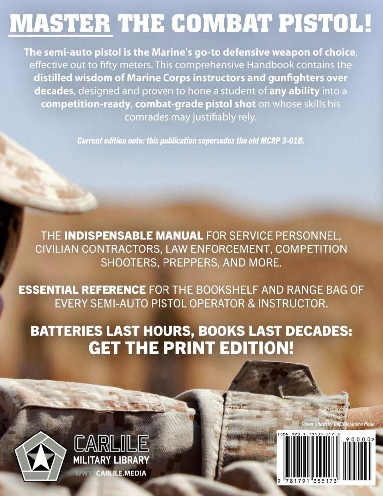 The semi-auto pistol is the Marine's go-to defensive weapon of choice, effective out to fifty meters. This comprehensive Handbook contains the distilled wisdom of Marine Corps instructors & gunfighters over decades, designed & proven to hone a student of any ability into a competition-ready, combat-grade pistol shot on whose skills his comrades may justifiably rely.